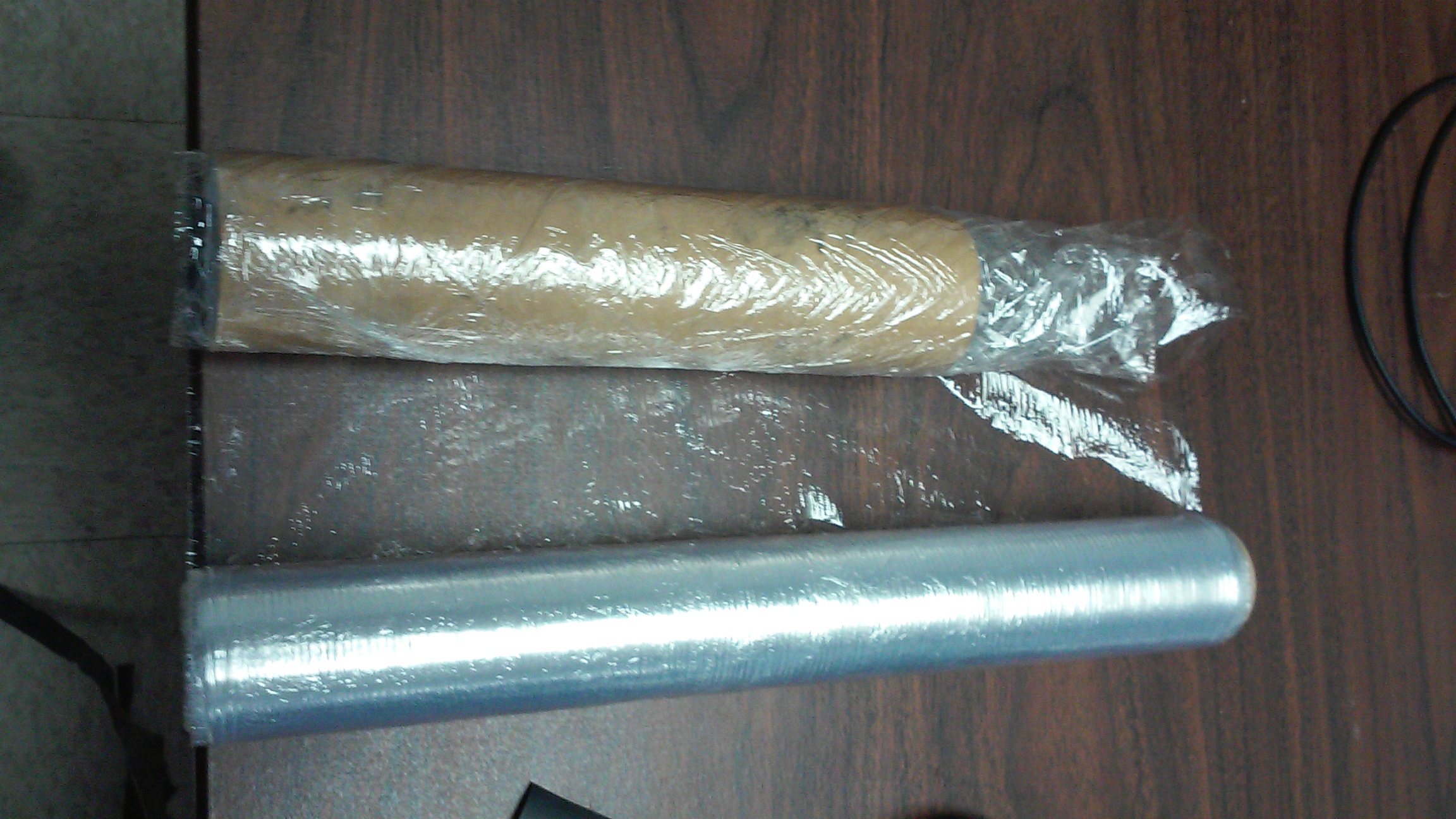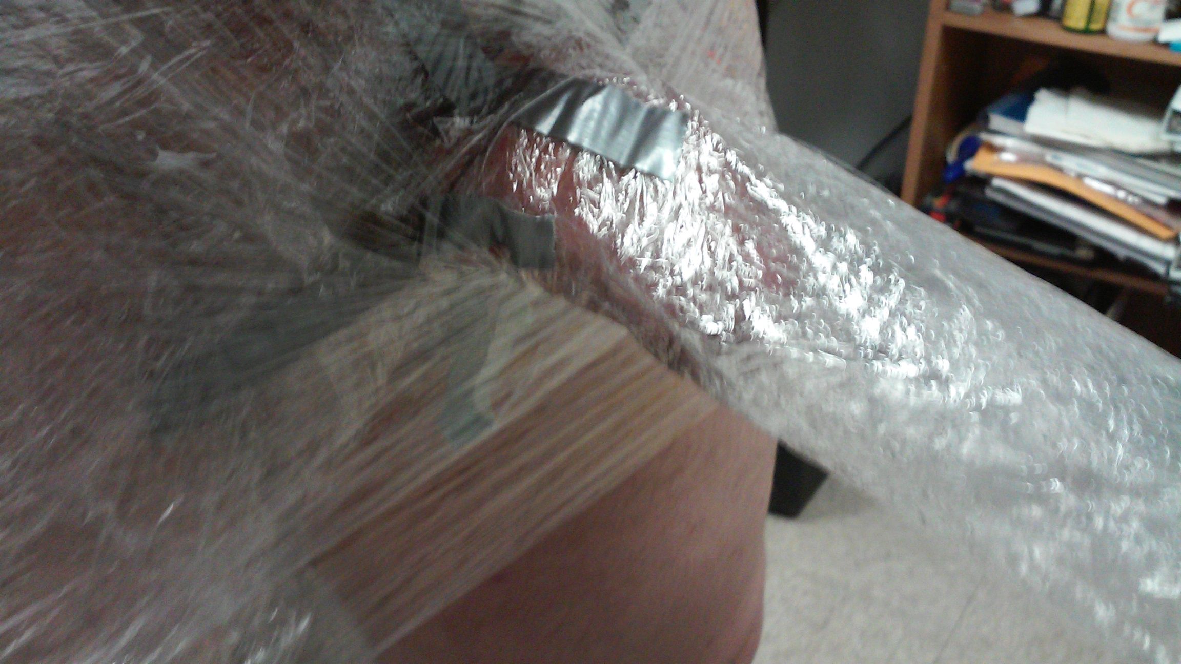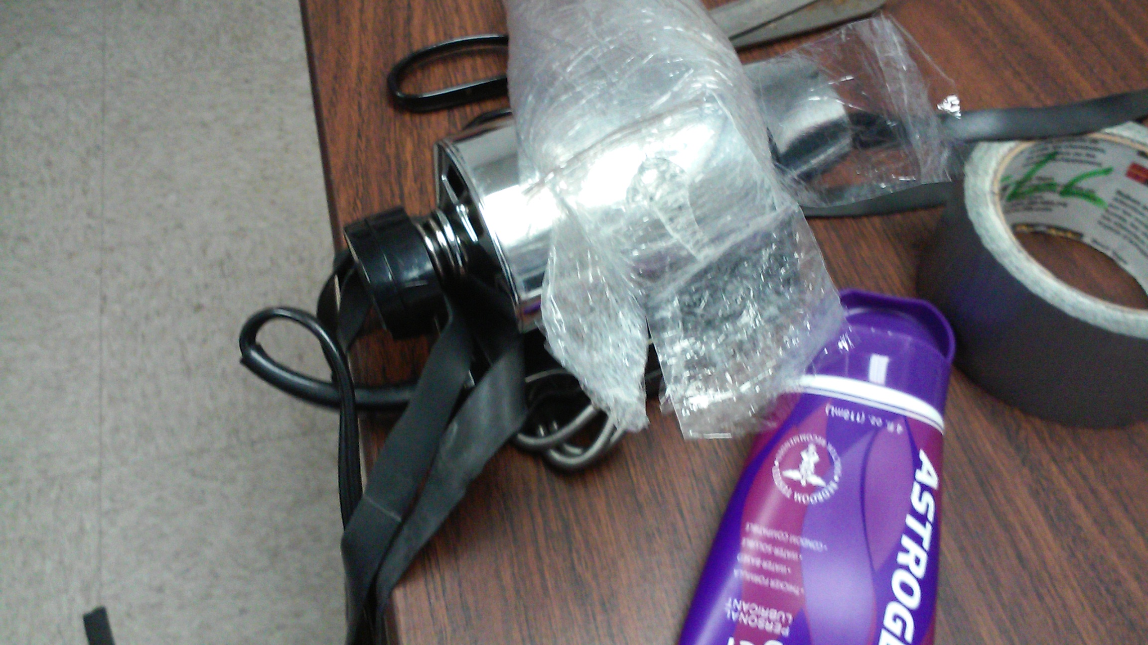 Next I wrapped on some tight glad wrap (cling film) shorts with only my penis sticking out. Using a card board tube I made a tube of glad wrap. Cut four 1 inch slits in one end and put a few shots of lube on the inside. Then sliding the tube on my penis and using a little duct tape I taped the for tabs of the tube to my shorts. Then a few more wraps to make everything look nice. Now I had a pair or shorts with a penis tube attached.