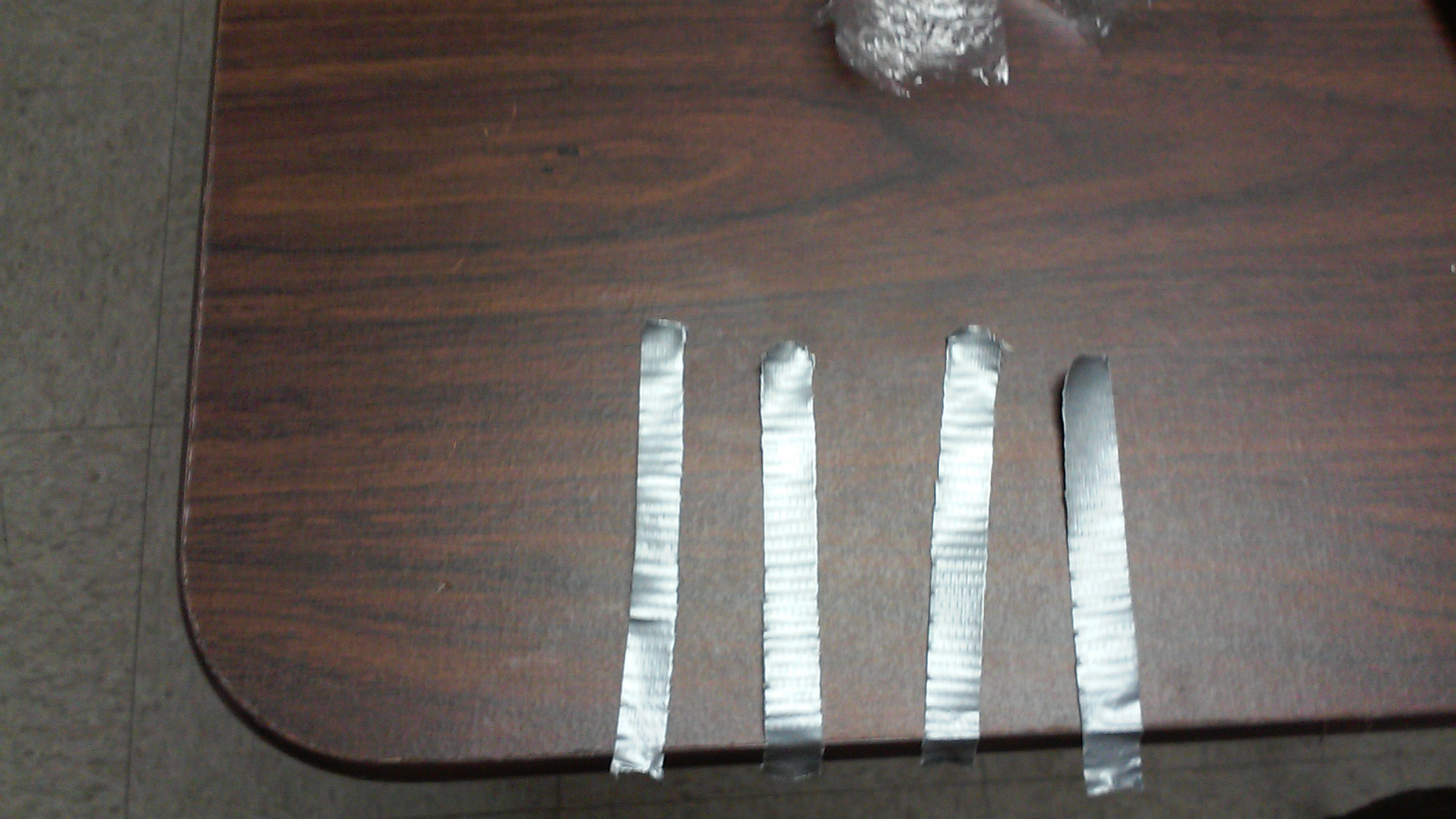 6) The four strips of duct tape used to secure the penis tube to the glad wrap/ cling film shorts