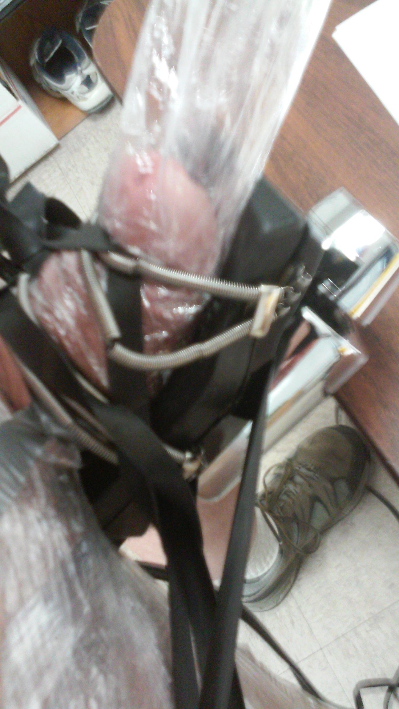 Then taking my vibrator and using the springs I slipped it over my plastic encased penis securing it tightly with some rubber strips made form an inner tube (bicycle tube). A few adjustments to get everything just right and I now had a nice vibrator attached to me.