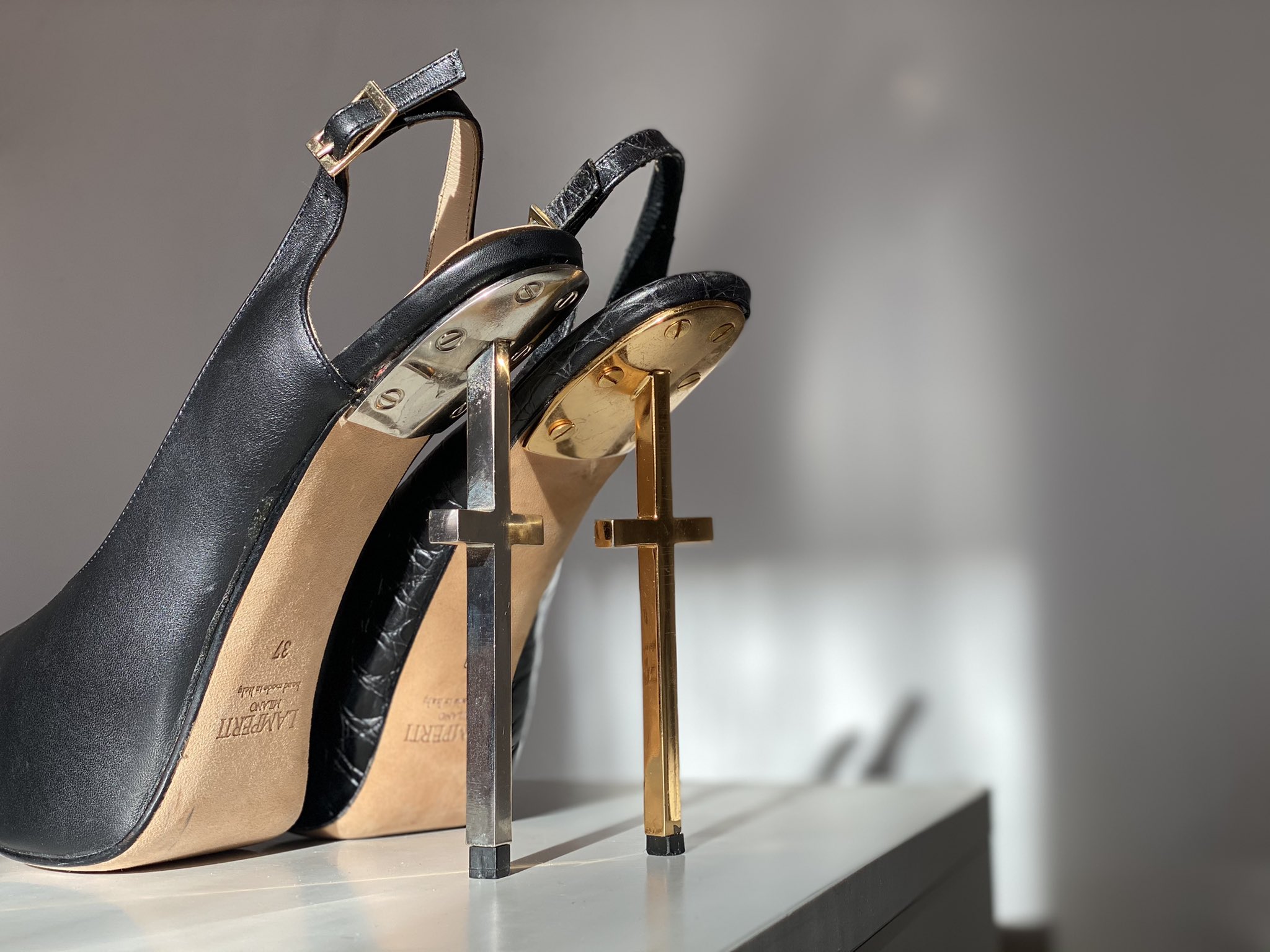 Since I do not visit any fetish parties, I'm pretty happy with 5" stiletto heels from Pleaser (an article about these shoes is in my queue and yet to be published). I use them for both self-bondage and fetish photos. (The old shoes are completely broken http://www.likera.com/eq/misc/heels1.php ).