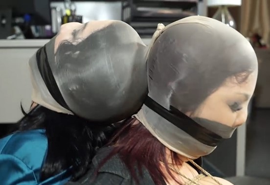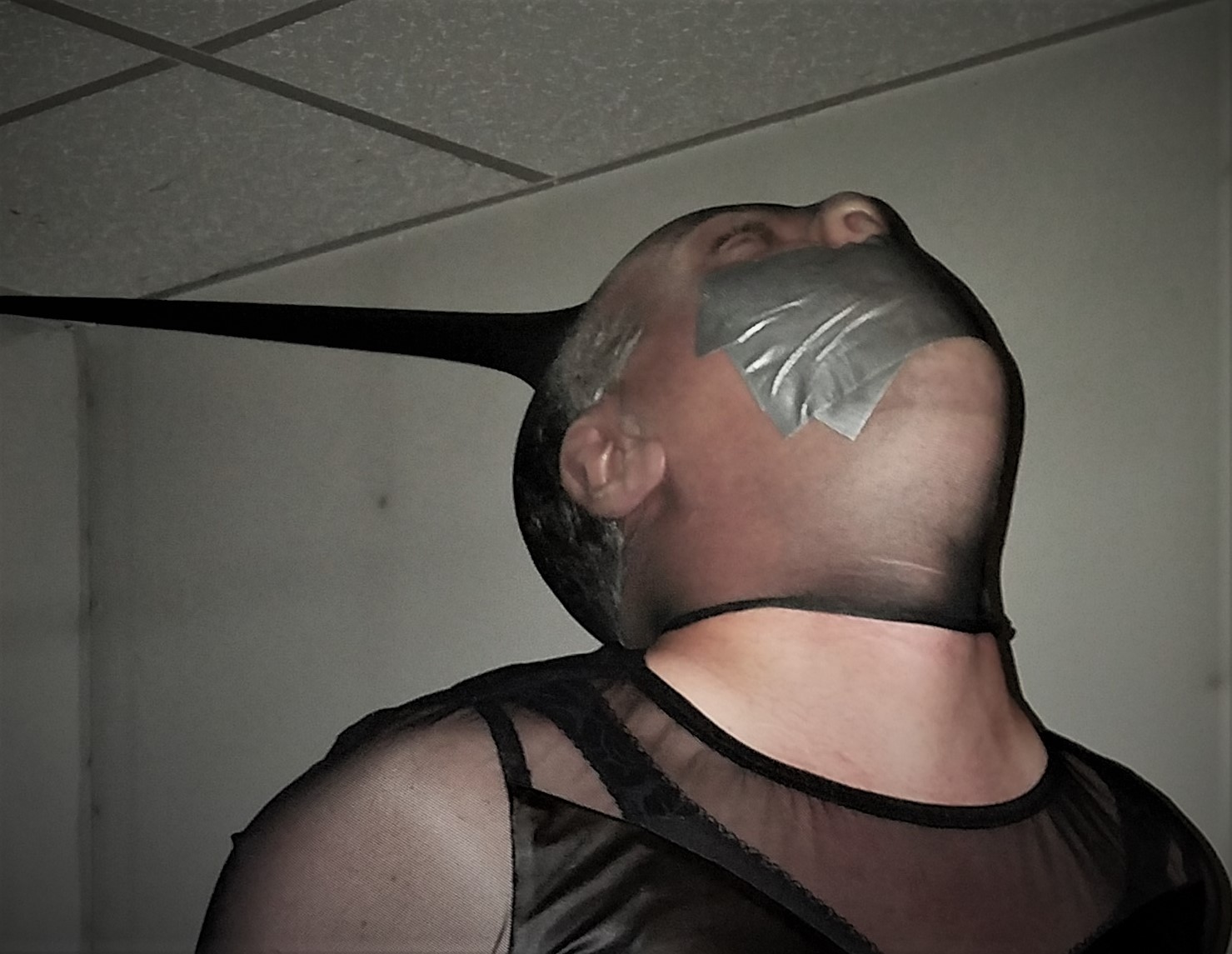 When the nylon is stretched out the gag is really pulled tight. I never thought a tape gag could get tighter, but boy was i wrong. Felt like someone was stuffing that rag down my throat. In the end, it only took about 7 minutes to get free of the stocking. Not every session has to be long, to be fun. This is a great way to start a session, with the idea being "you're tied here and need to struggle to go and get your 1st key."