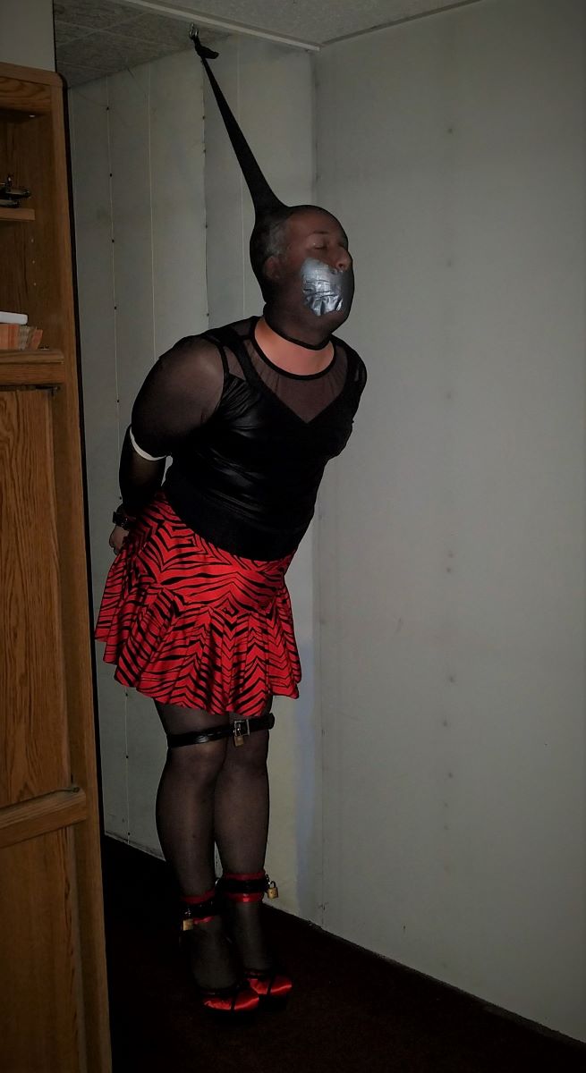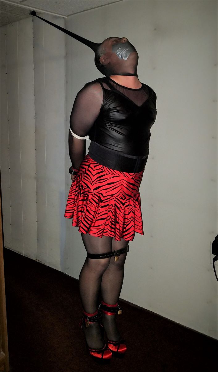 I did also have a chastity cage and nipple clamps on, but those are additions on a personal basis and not a requirement. After everything is tied, the only thing tethering you in place is the nylon hood. Small baby steps will lead you to freedom. Or suffering. The tie isn't too bad, as long as you can stand comfortably. Upon shuffling away, you find your head is wrenched back and slowly pulling you off-balance. Twisting and turning your head is the way to freedom, but again, watch your balance.