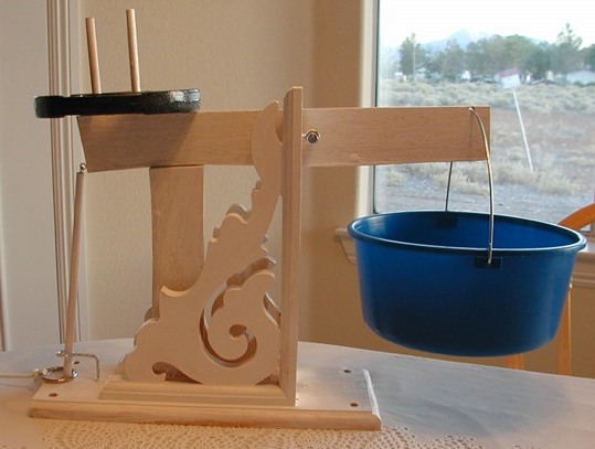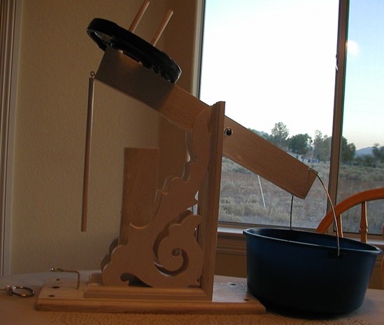 Now the timing mechanism itself, a source of water (or other liquid) that will enter the bucket. Once enough weight of water is in the bucket to offset the weights added to the other end of the arm, then the rod will be pulled out of the hole and the lock ring will be released, dropping a key or removing the anchor point of a binding.