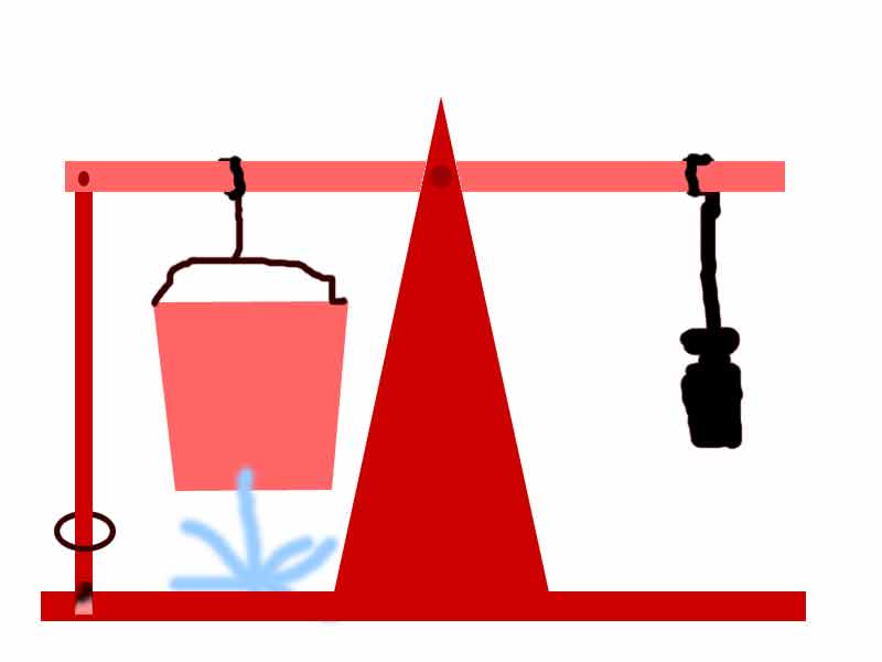 Since using water from a tap tends to be messy, it might be interesting to put the bucket on the other side of the beam, make a hole in the bottom and let it run dry. There should be a counterweight on the other side (where the bucket is on the original) to lift the rod when the bucket is empty. I made a rough drawing. Of course there should be another bucket underneath the bucket, to collect the water. And I think, it should be enough to make a hole in the base to keep the left rod in position until it is lifted. The size of the hole in the bucket would determine the time until release. You could use various corks with different hole sizes to change it quickly. A tap would work too, but is probably less predictable. The advantage of this device is that the bucket will eventually run out of water. On the original device, if the water source or the device is misplaced by an accident, it won't ever release. |