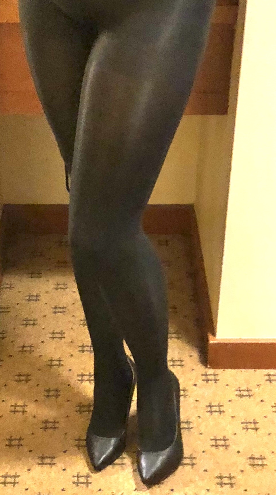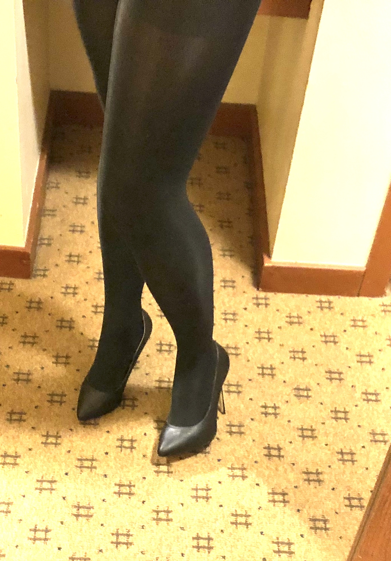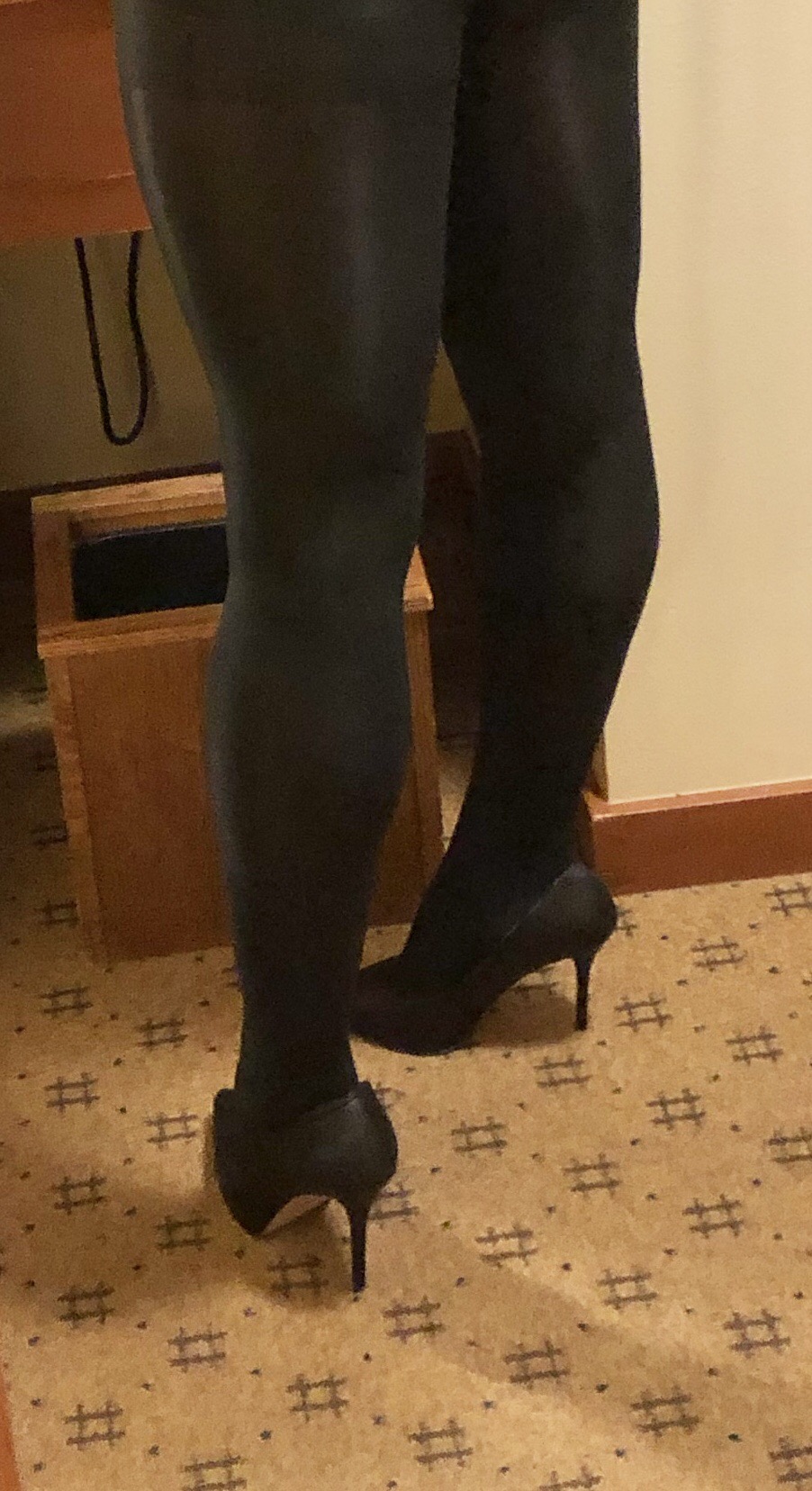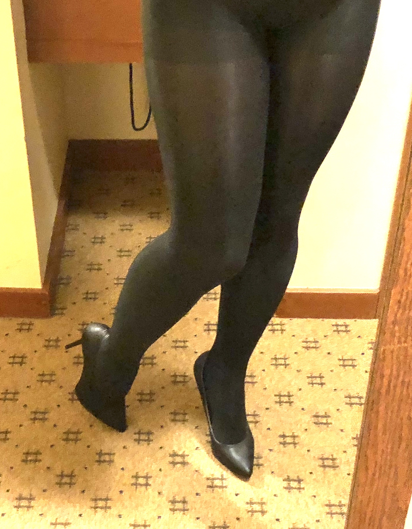 Playing in layers of black pantyhose with my new (size 12) heels. 😊