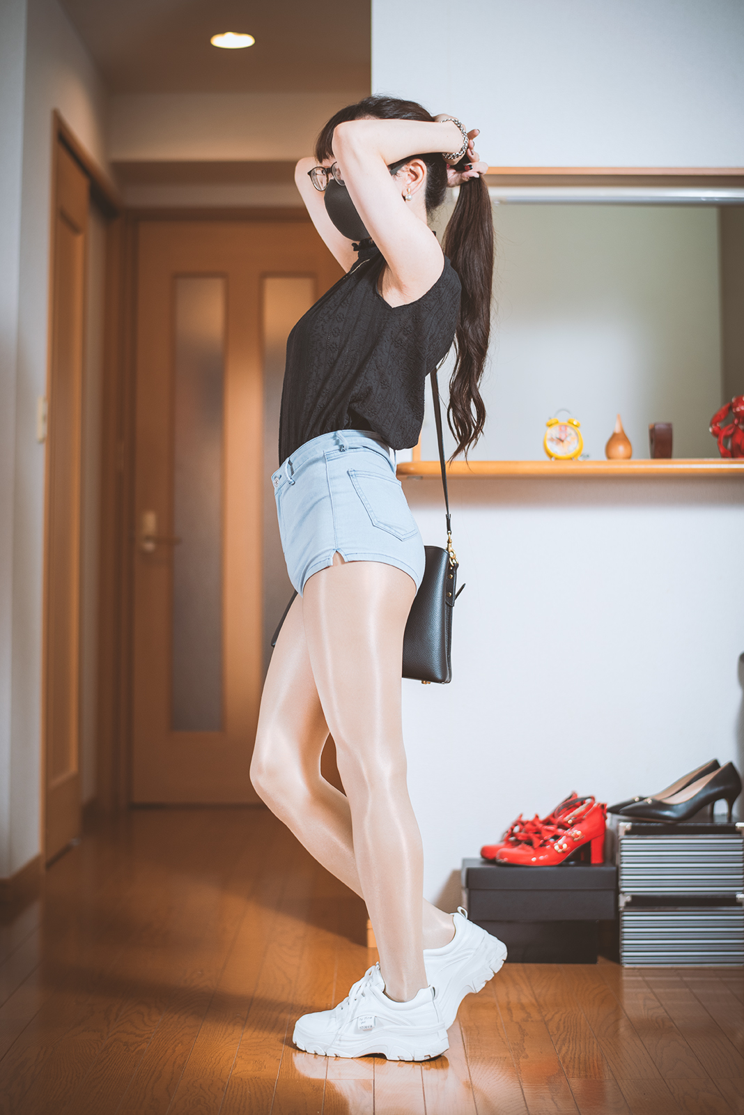 Source: https://twitter.com/sutiblr (20 Jul 2022, 00:11 )Like Ra Wrote: Ah, I love this style! Shiny pantyhose, mini-shorts and sneakers are made to be worn together! The shoes in the background hint at some interesting activities occurring soon... Very nice Ra. Thanks.