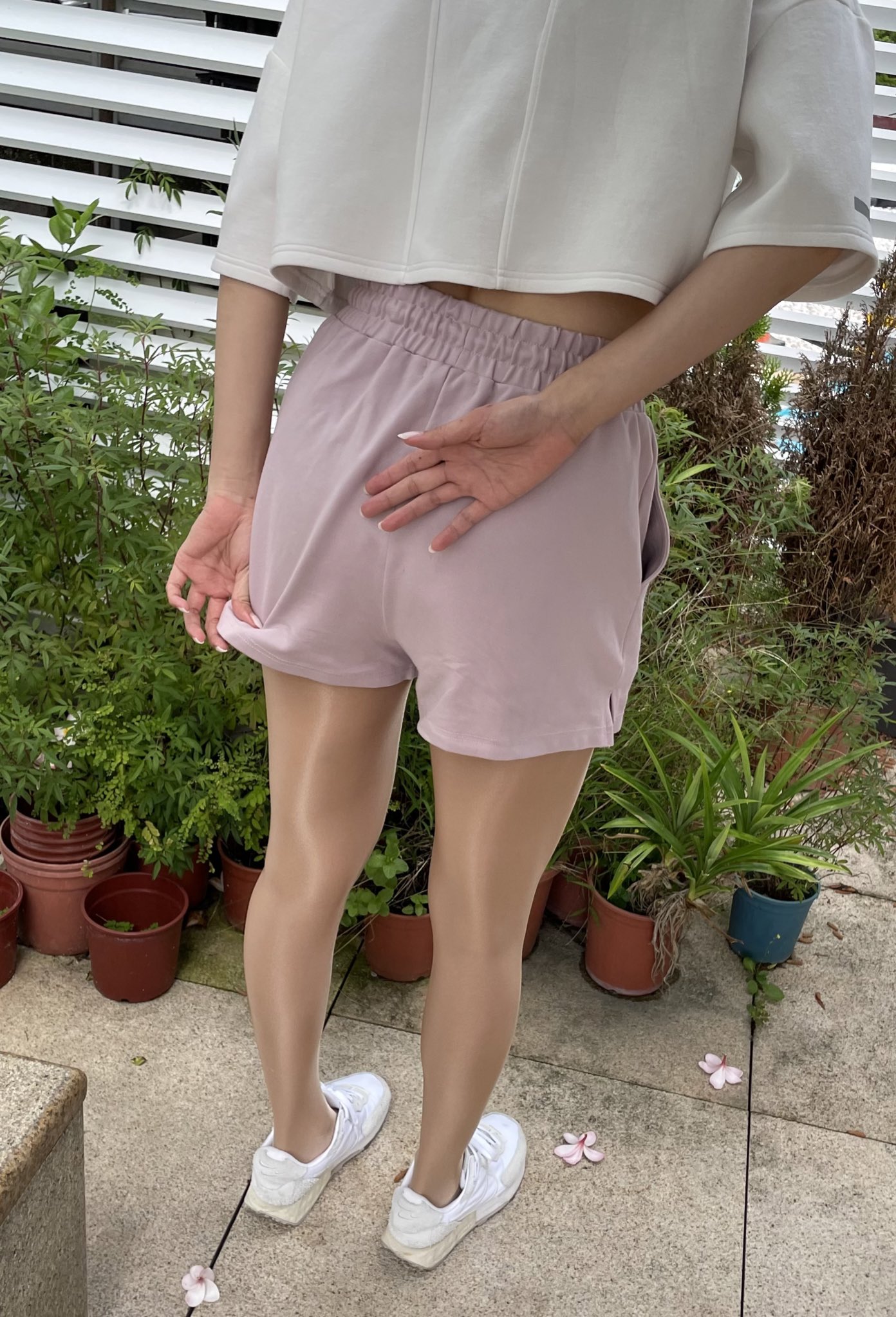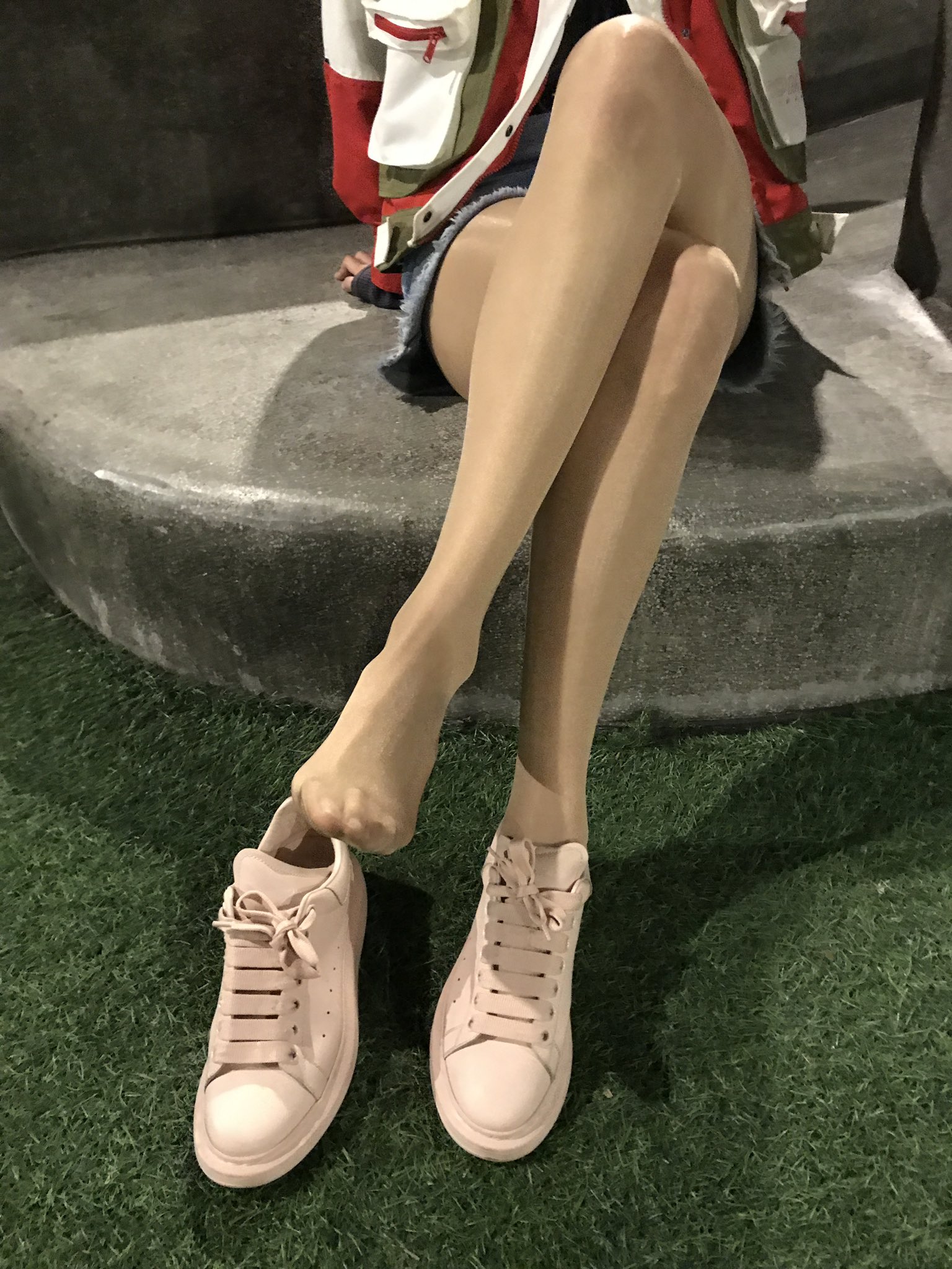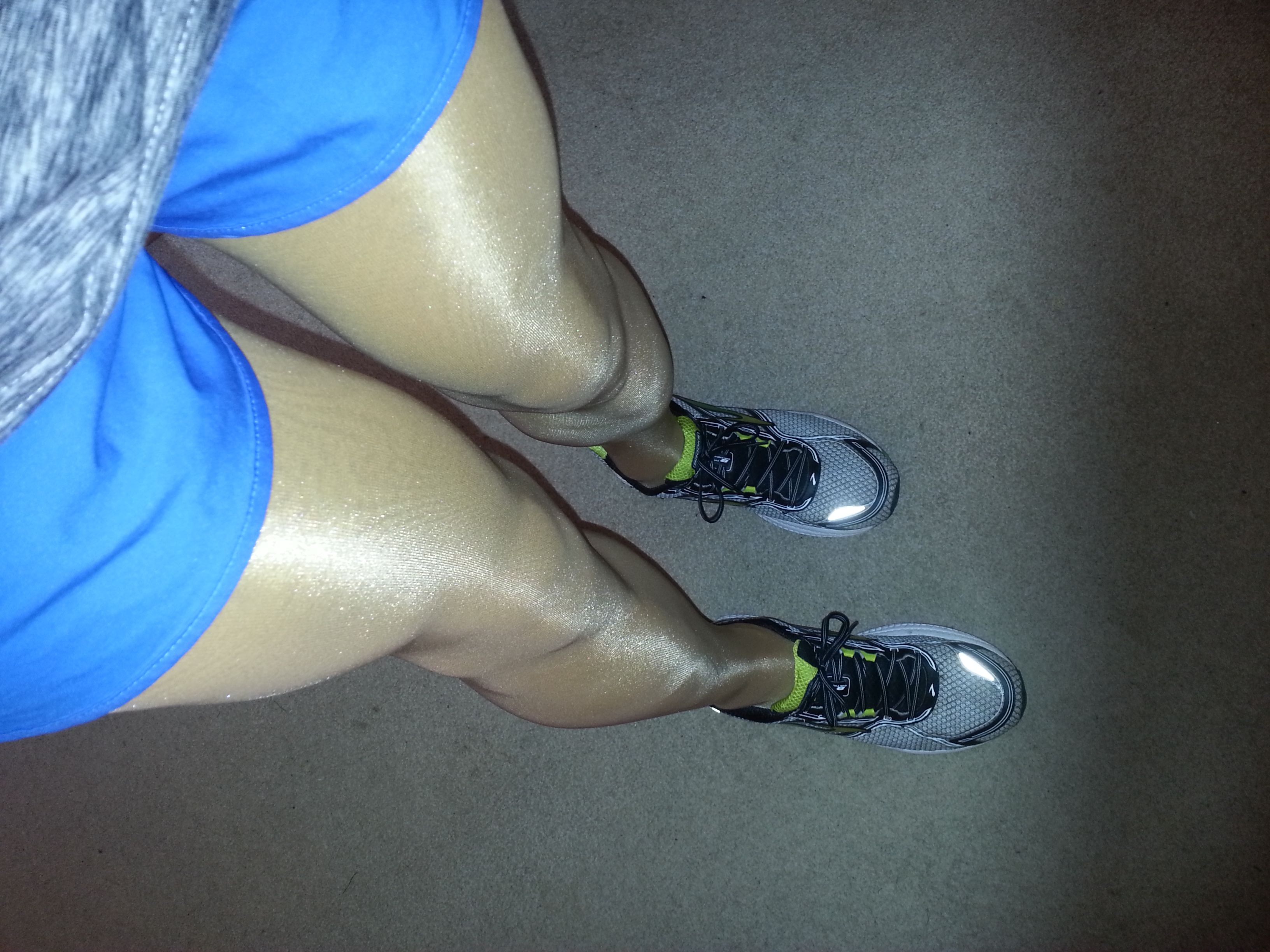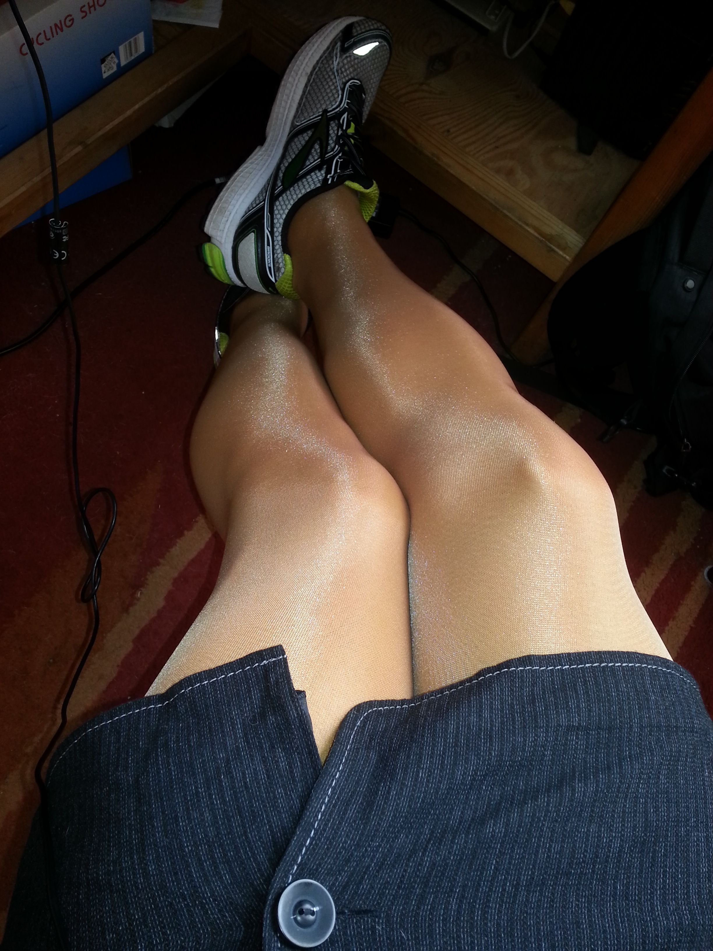 Something short, shiny pantyhose, and sneakers. Can it be any simpler? I mean... And publicly acceptable?