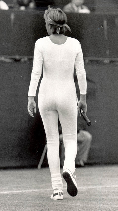 let's remember Anne White who (twenty-five years ago this year) finished warming up in her match against Pam Shriver and took off her track suit to reveal this:
