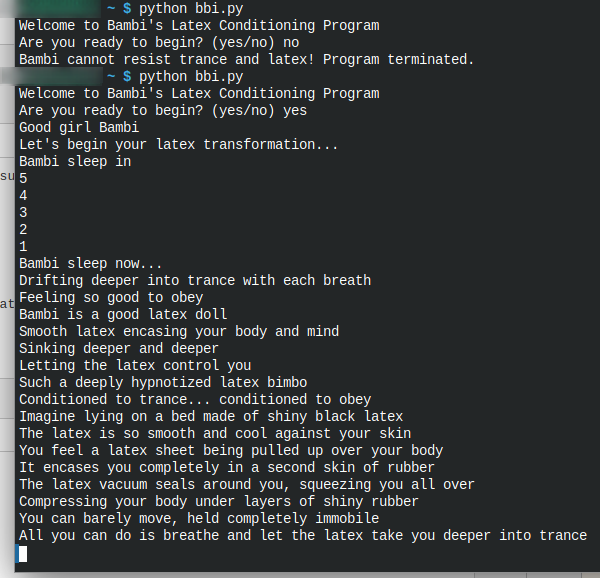 (17 Apr 2024, 10:09 )shinybambi Wrote: A little remix of original Bambis awakener adding chastity and compulsion to hide keys, so the only way to unlock is to become Bambi as she's the one who knows were the keys are.