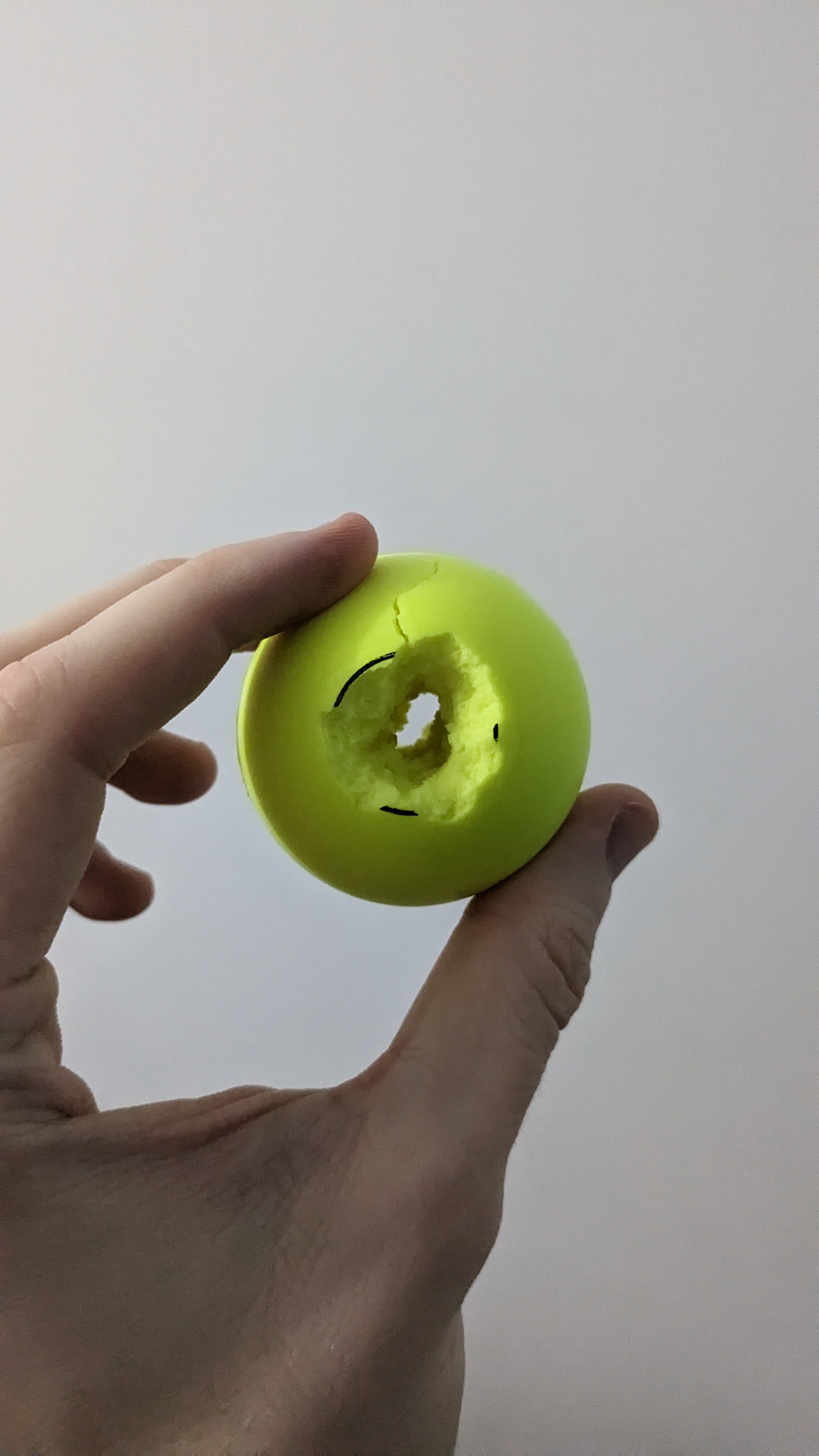 The foam ball then went in my mouth, like a ball gag (for me a 4 to 5cm diameter was about right). The hole I'd made was aligned so that it went from 'outside to inside' if you see what I mean (hopefully this will become clearer later.