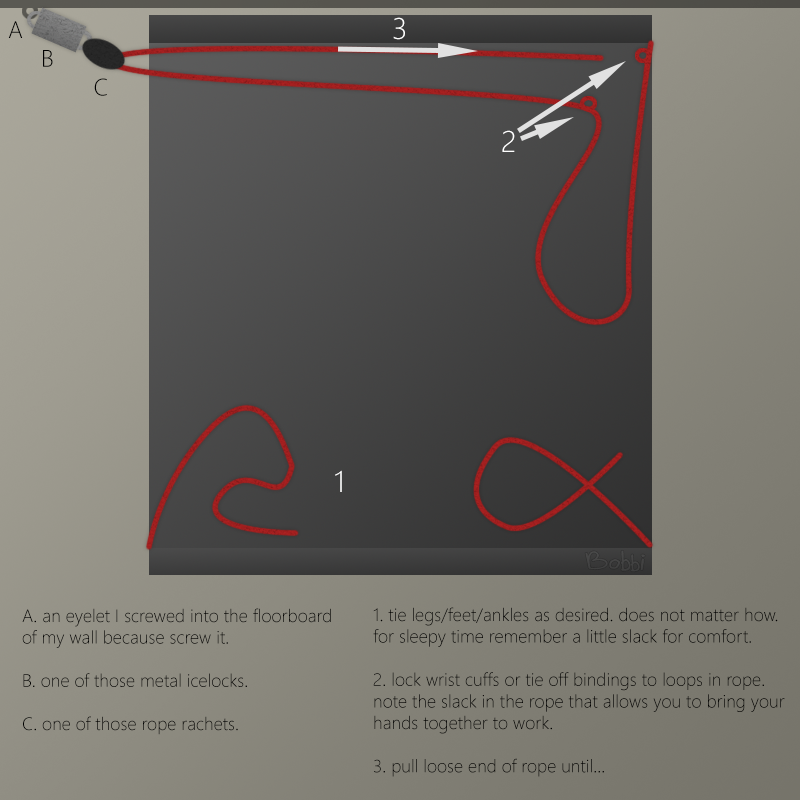 tumblr_o10do2I4GR1ro31hto1_1280.png     tumblr_o10do2I4GR1ro31hto2_1280.png     tumblr_o10do2I4GR1ro31hto3_1280.png    - Bobbi is one of my self-bondage inspiration sources. I may not share every aspect of Bobbi's lifestyle, but I love to read the posts. Best of all, all of what Bobbi does is real and achievable, unlike much of what you see on the internet.