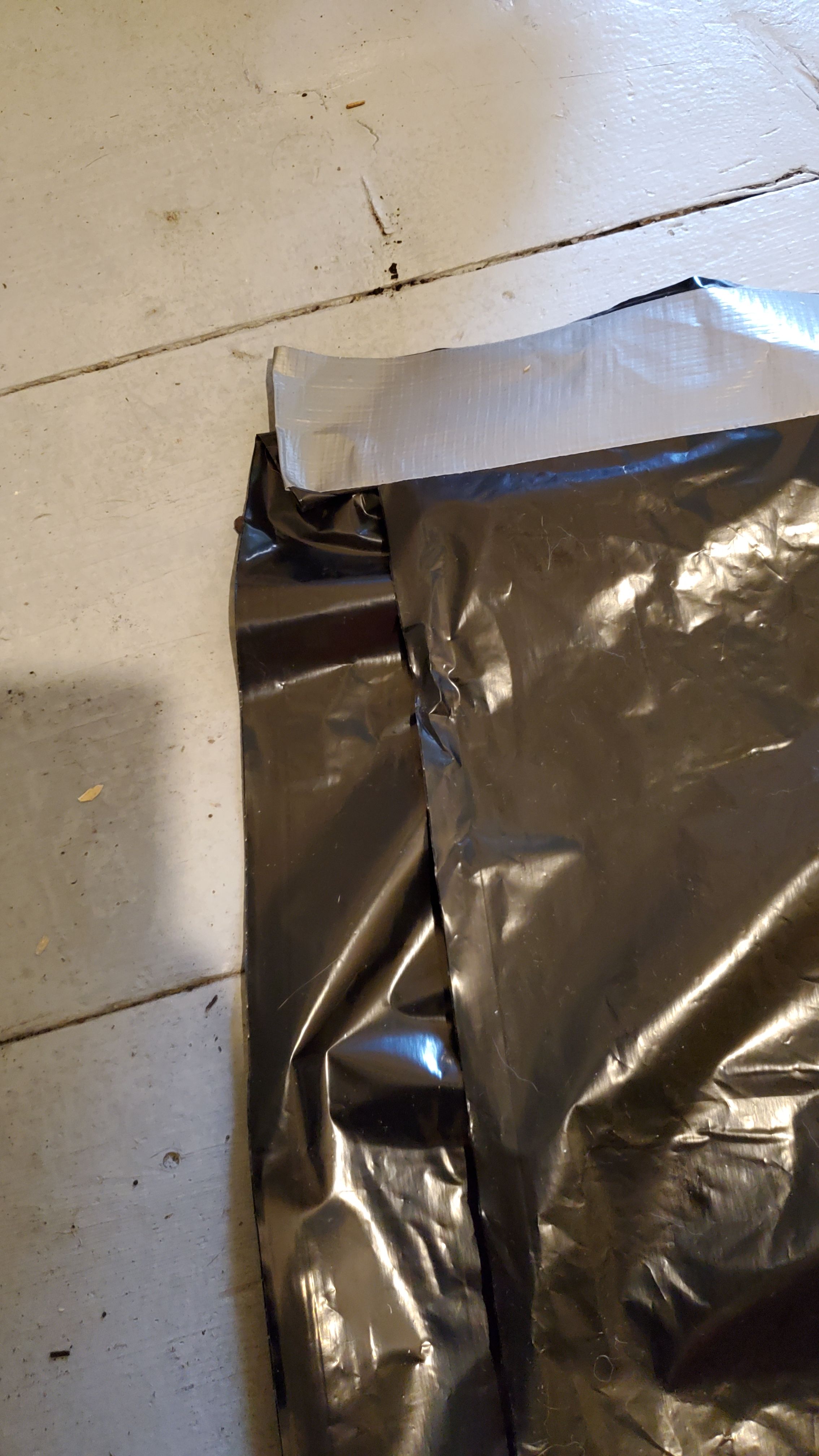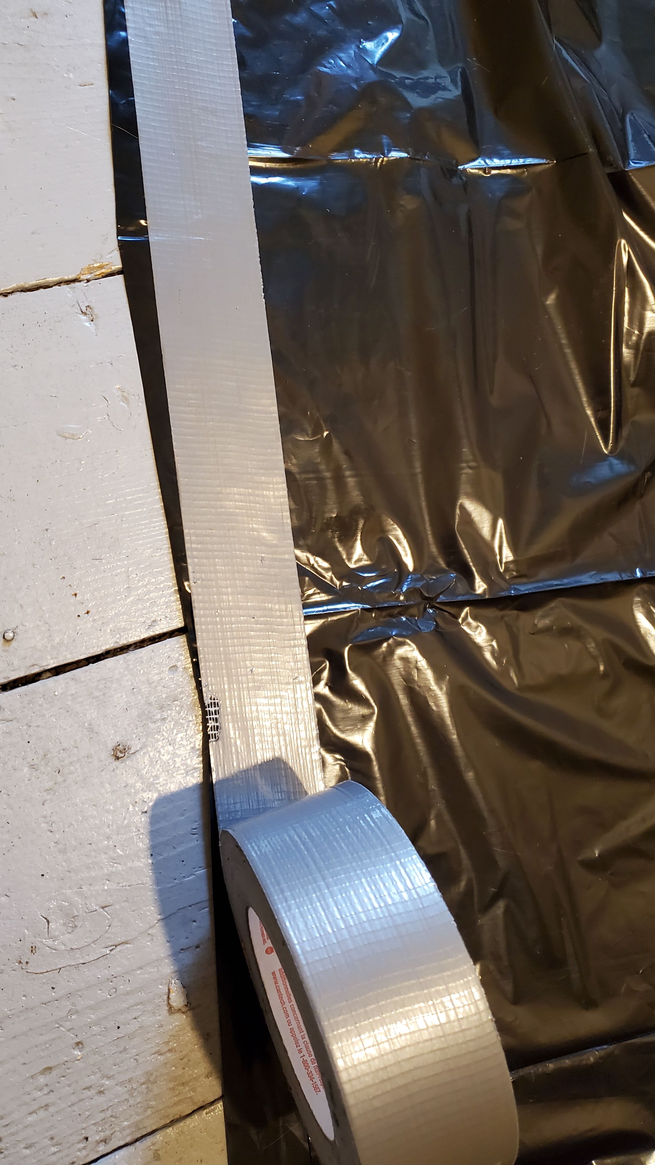 Then, I folded it to get a 8 ft. x 6 ft. piece, and I used some duct tape to join the two edges together. The offset is about 1 inch (2,5 cm) between the top layer and the bottom layer, as shown here: