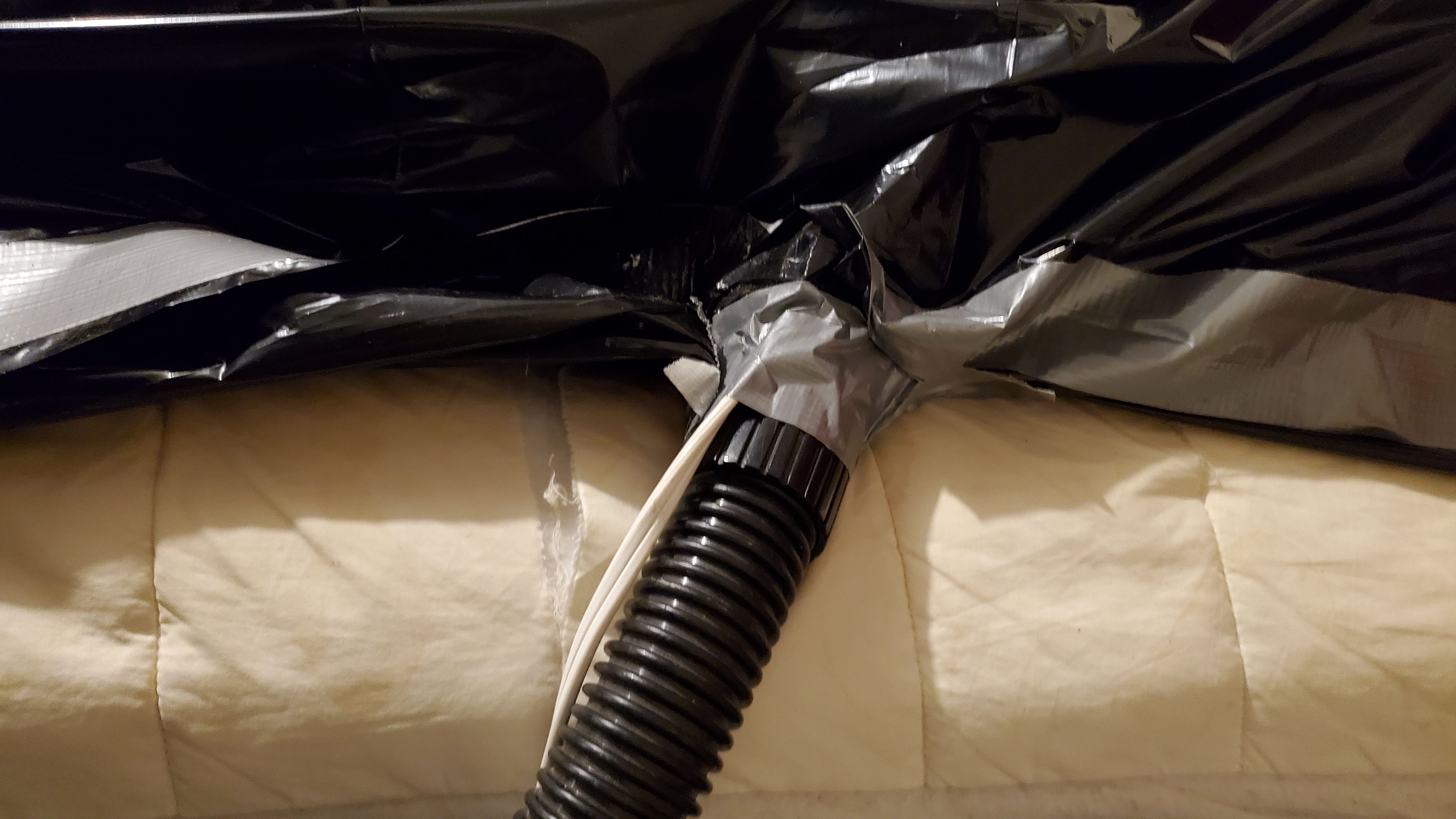 So I breathe thanks to a very small hole I punched with my teeth while the vacuum was pressing me on the mattress.