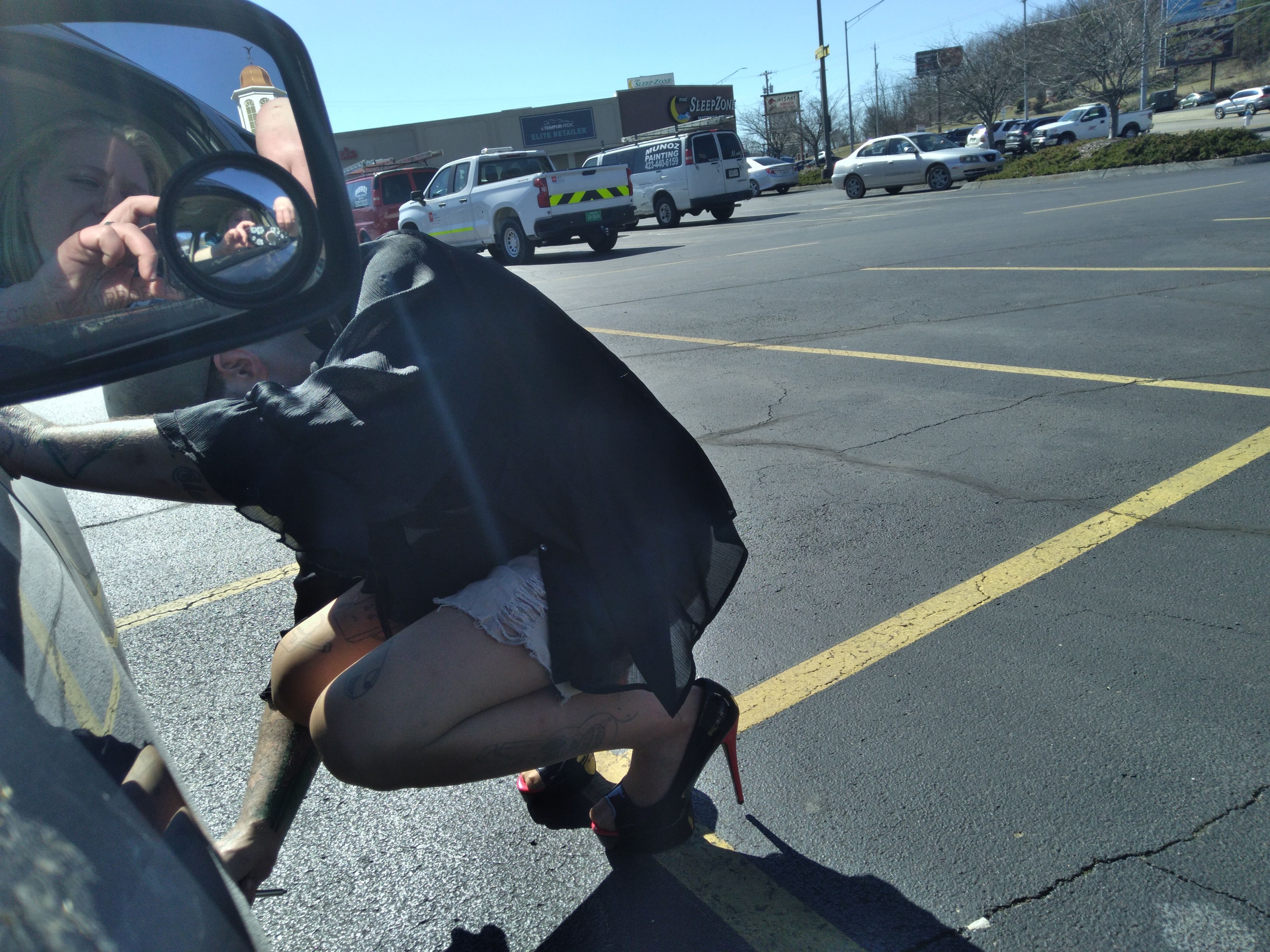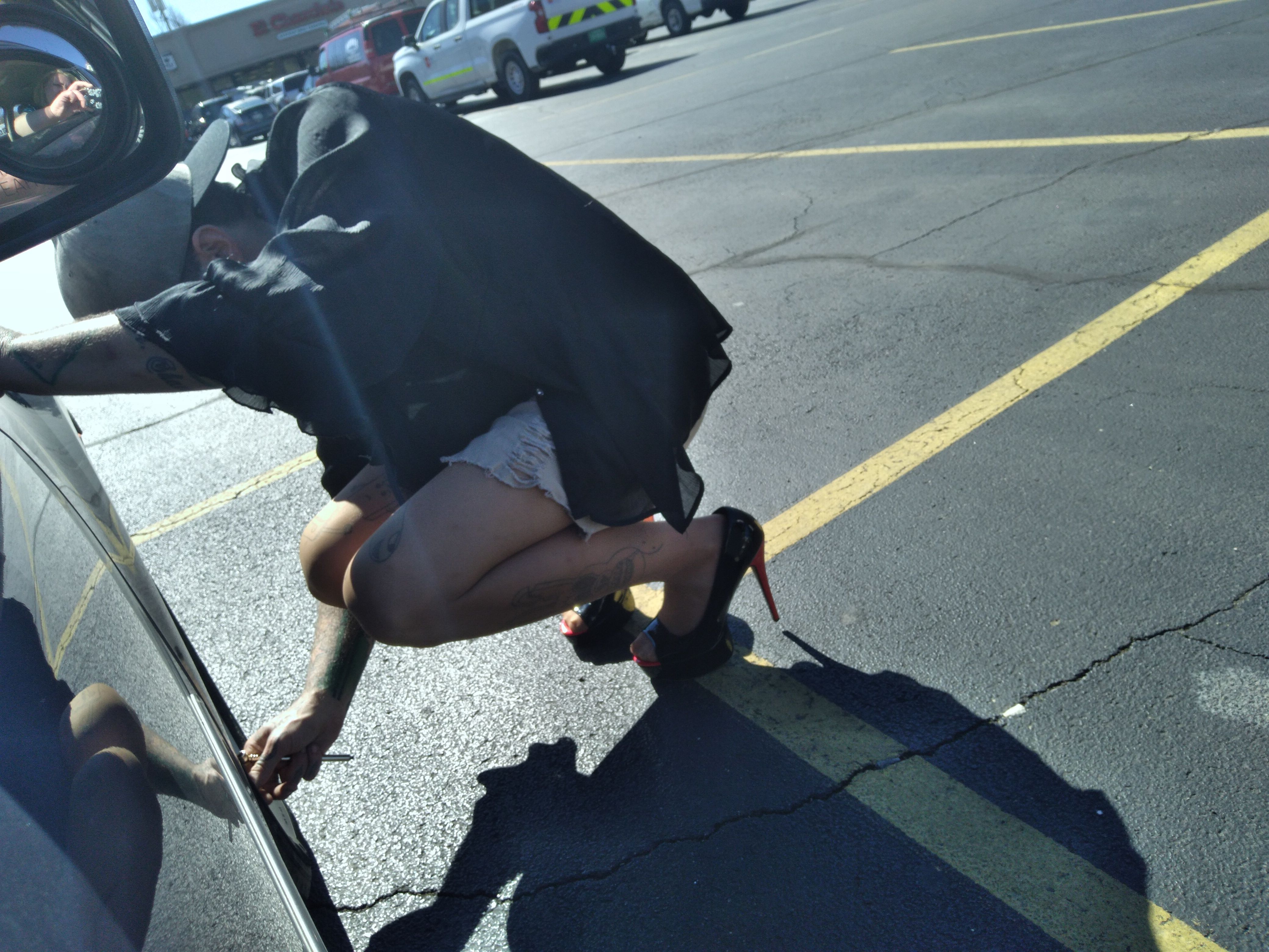 So my wife and I were sitting in our car at the local grocery store, and she said outta nowhere, 'i bet you wont put on some hose, a skirt, this leopard print bra and sheer button up shirt (as she handed them to me) and those awful black & red peep toe platform heels, and get outta the car, walk around the front to the passenger side and check the air in the front tire...BAHAHAHA