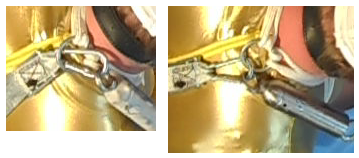 As you might have noticed I had to much going on for wearing gloves and a blindfold to unraffle so I did not manage to cinch the wrist loops into an inescapable tie. Trying to keep the elbow tie simple also resulted in it not working very well so the tie was not secure. This turned out to be a really good thing because I was using an ice lock to hold the strap ratchet. I put it trough an O-ring, the rod from the lock will slide trough but the lock's exterior can not so I'll have to wait for the ice to melt and then I can free my hands. Except during the tying the carabiner I used for easily connecting the straps trough the O-ring to the ice lock snapped itself shut over the O-ring! Meaning if my tie had been secure I would have been stuck. See here: