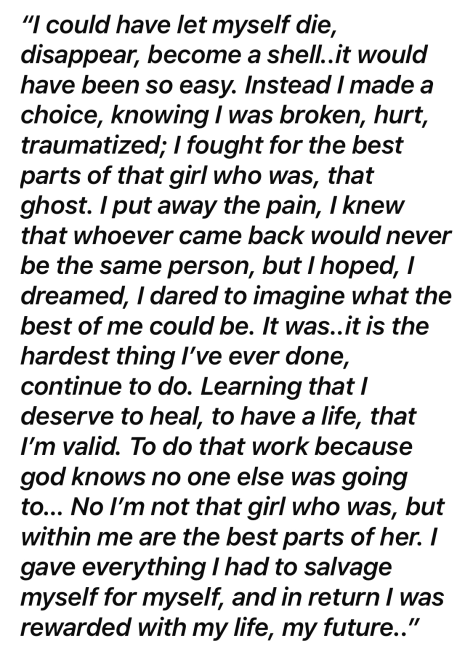 Thank you, so much for saving me, from myself. For stepping up, when I hurt you so much, I am so sorry, a debt, that I will keep working to pay off. To make right. Thank you. I love you all! Thank you for saving me.