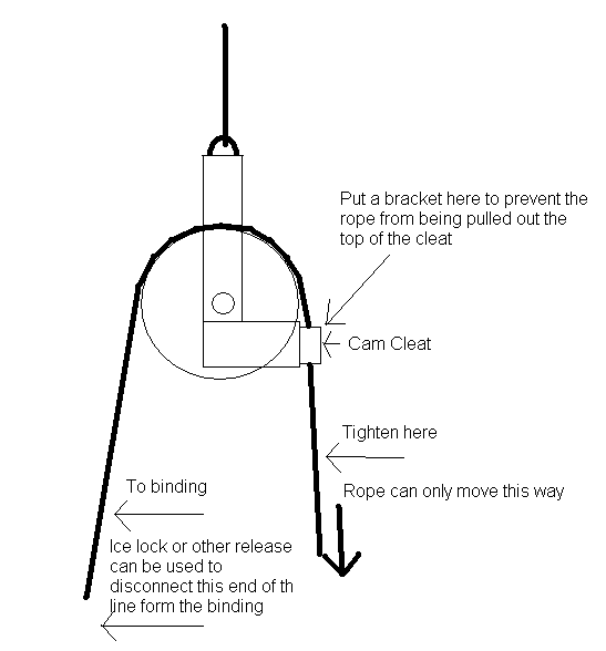 - Like Ra - 06 Oct 2007 Sounds exciting :-P I've been thinking (read "dreaming") about something like http://www.extremerestraints.com/the-anal-impaler_391.html?a=likera for ages, but the associated price and danger stops me from ordering one. - doubleflash - 07 Oct 2007 Ra, It was exciting 😯ops: I agree that the commercial products like the "Anal Impaler" are expensive and could be quite dangerous. I like the standard police nightstick because it is cheap (~ $15.00 for wood, $30.00 for plastic) and because it is rounded and smooth on the ends. The diameter is about 1.25 inches, so it has a fairly large surface on the end. I've never had any damage from the nightstick during any of my SB scenes. I am very careful not to get into a position where I could fall or somehow have the stick shoved in too deeply. During some scenes, I use a nightstick that I've modified to be safer. I've drilled a 3/8" hole through that stick about 4 inches from the end. I've forced a smooth 3/8" steel rod throught the hole. The rod protrudes about 2 inches from each side of the stick. The rod stops over-penetration, but still lets enough of the stick in to my anus to be interesting. The rod also makes a good tie point for crotch ropes or rubber tubing harnesses.... Lots of possibilities. Doubleflash RE: Problems with the 'ring device' - susanr - 11 Oct 2010 I have gotten an idea for a one-way device that uses a rope. On my sailboat there is a device for tightening the mainsheet. Essentially it is a pulley with a cam-cleat on one side. The pulley itself hangs from the boom. One end of the mainsheet is tied off and then runs over the pulley and through the cam cleat. The line moves easily through the cam cleat in one direction, the direction where you pull the line to pull in the boom. The cam cleat holds the line so that it will not slide the other direction. On the sailboat removing the tension involves pulling the line upwards from the cleat, which uncleats it and allows the boom to move outwards. I have been thinking that this could replace the ring device. Hang the pulley from wherever you would normally hang the ring device from. The binding line you use then goes over the pully and through the cam-cleat. If a bracket is placed on top of the cleat then it would be impossible to pull the line out of the cleat, making a very effective one way tightener. This could easily be tightened with a single hand and would not release the tension on the line until your ice lock or whatever other release you use releases the line on the other side. Here is a drawing to give an idea what I am talking about. Next time I go out to my boat I will take a picture of this pulley setup so that you all can get a better idea of how it works. RE: Problems with the 'ring device' - Like Ra - 11 Oct 2010 Looks like another version of a rope-ratchet. RE: Problems with the 'ring device' - relatex - 06 Jan 2011 (11 Oct 2010, 23:22 )susanr Wrote: I have gotten an idea for a one-way device that uses a rope. On my sailboat there is a device for tightening the mainsheet. Essentially it is a pulley with a cam-cleat on one side. The pulley itself hangs from the boom. One end of the mainsheet is tied off and then runs over the pulley and through the cam cleat. The line moves easily through the cam cleat in one direction, the direction where you pull the line to pull in the boom. The cam cleat holds the line so that it will not slide the other direction. On the sailboat removing the tension involves pulling the line upwards from the cleat, which uncleats it and allows the boom to move outwards. Cam cleats are an excellent means of ensuring a rope will travel easily in one direction but not at all in the other, and if fairleads are used fore and aft of the cleat there is no chance of the rope accidentally popping out of the top of the cleat. However, they have one big problem, namely that they (and the fairleads) must be fastened to a rigid base. I used to sail (some years back) and from that I too got the idea of using cam cleats for sb by fixing two small cam cleats and their fairleads to plywood bases, and attaching the bases to the lower parts of the legs of a high bed. The ropes running through the cleats were tied to the electric cables of a couple of vacuum cleaners - the sort where the cables are self-stowing and you tug on the cable to start the self-stowing mechanism. (That was the essence of the set-up, there was a bit more to it in practice, but I hope that explains the concept. Like other contributors to these pages, I cannot draw for toffee, so words are the best I can manage.) It worked sort of OK, but would have been better if the self-stowing cable mechanisms of the cleaners had generated more 'pull' to get the ropes through the cleats more positively. It was just experimental and very Heath-Robinson, and the resulting sb was a bit too static for my tastes, so it was a short-lived pursuit that I never tried to refine. Pulleys and falling weights would work OK to pull ropes through cam cleats. Although I've never gone back to cam cleats, I have always had a fantasy about very small ones fixed onto/into a leather body harness as a means of fashioning, in effect, a straitjacket - ideally in conjunction with small versions of those vacuum-cleaner type spring-loaded mechanisms to pull and stow the ropes (I've long been fascinated by the possibilities of such devices, but have no detailed idea of their workings). But I'm not sure if it would be practical to attach even small cam cleats, let alone self-stowing devices for ropes, to a leather garment - the leather would at the very least need to be pretty thick and rigid. More generally, though, cam cleats might have applications in other sb scenarios....it needs someone with more imagination and more engineering nous to come up with ideas. RE: - paul knight - 12 May 2011 (10 Jul 2007, 13:37 )Like Ra Wrote: I've been searching for a SRD replacement for quite a while now. The last coup