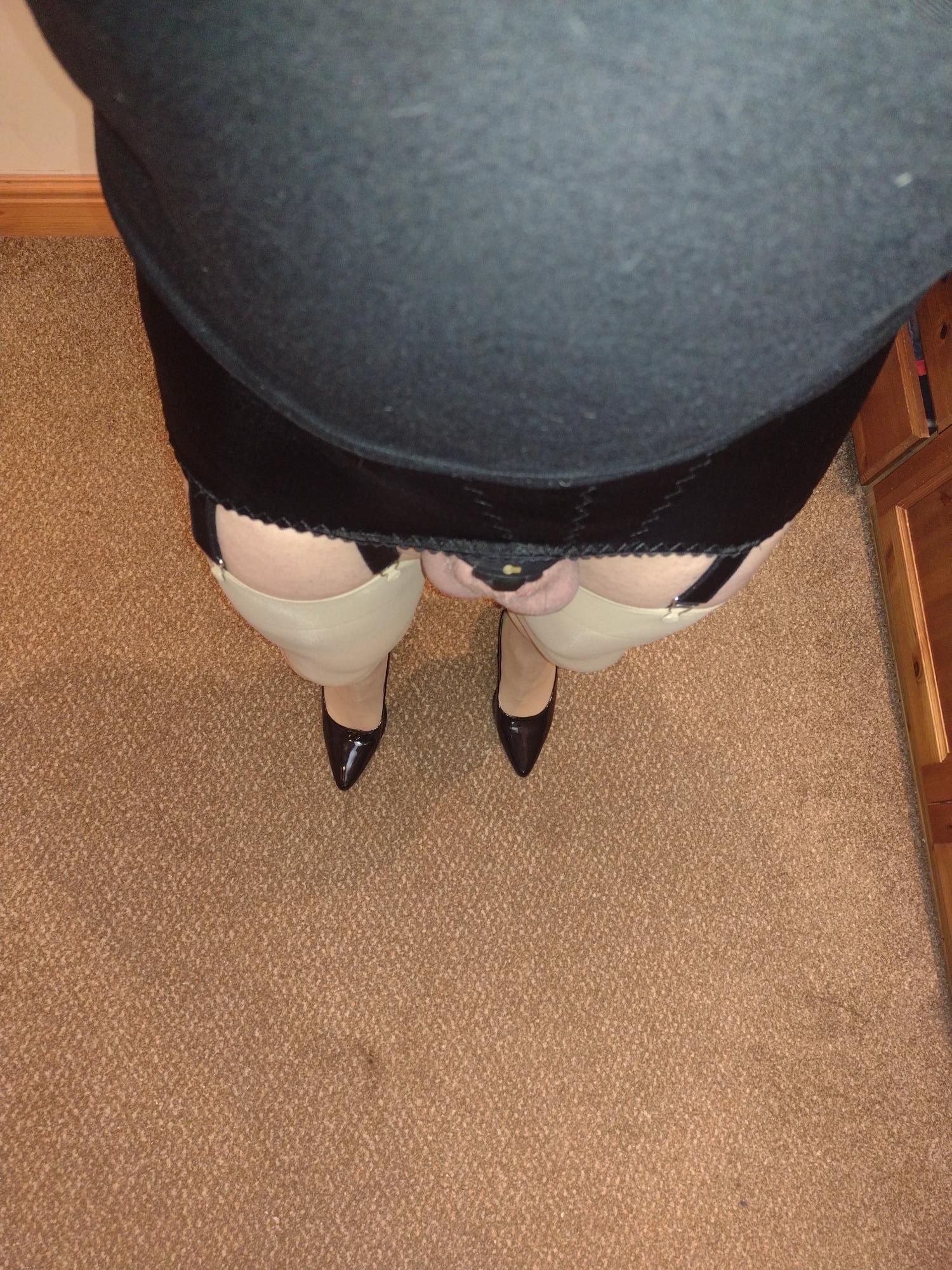 A short video clip too - which I can remove if the file size is causing too many issues Enjoy MJ RE: What pantyhose/stockings are you wearing today? - Like Ra - 23 Jan 2025 (22 Jan 2025, 22:26 )madjack Wrote: A short video clip tooYeey! Properly POV now! RE: What pantyhose/stockings are you wearing today? - madjack - 24 Jan 2025 How strange - convinced I'd posted this, but can find no trace, so here we go again... Thursday saw me wearing these: To be honest I'd forgotten I'd got them, an eBay purchase from last year. I'd brought them because they had an 'open sheath' which I wanted to try out, with an idea for a future adventure. To be honest I was a little disappointed at first - the fabric is very strange, hardly stretchy at all! It also feels 'rough' to the touch. I was convinced I'd ladder them pulling them on, but didn't. I also don't like the 'look' of them - the black is 'washed-out' and they look cheap 'n' nasty (the 'gloss' is as a result of a flash when taking the photo, they are actually quite matt). Despite my initial feelings, I did persevere, even experimenting with a cage over the tights This worked quite well, until halfway through a video call! Then it slipped off, squeezing one of my testicles quite painfully as worked loose - how I kept a straight face I really don't know!!! 😟😒 To be fair, all the wrangling to get the cage on failed to damage the tights, so they appear to be more robust than I first imagined. And the longer I wore them the more I began to enjoy the strange feel of them squeezing my legs all over. They also felt strangely nice under trousers, very different from the usual tights I wear. So, although I might not be buying them again, I'll not be tossing them straight in the bin either. MJ RE: What pantyhose/stockings are you wearing today? - madjack - 24 Jan 2025 Today I really broke new ground and spent most of it in stockings! I know! What is the world coming to? MJ wearing only stockings? 🤔 🤔 🤔 🤔 It'll be fishnets next........... err, no, No, NO it won't! 😁 8-strap garter belt, tan stockings, killer high heels and my tightest/smallest cage - penance had to be paid for my chastity failings yesterday. 😉 I still find it incredibly difficult to walk properly in those heels, but I keep trying...