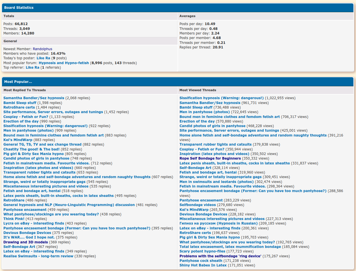 RE: Site statistics - Like Ra - 01 Jan 2024 Most active threads in 2023: RE: Site statistics - Like Ra - 01 Jan 2024 Since we moved to Cloudflair, the bandwidth jumped to over 2TB per month, because now to view attachments it's not needed to register. So, the attachments are accessible to search engines now. Notable achievements: we have the first thread with more, than 1 million views (currently 1,023,118 views) - https://www.likera.com/forum/mybb/Thread-Sissification-hypnosis-Warning-dangerous This thread is close (961,890), but still not there yet: https://www.likera.com/forum/mybb/Thread-Samantha-Bandler-Sez-hypnosis Any other statistics you would like to see? |