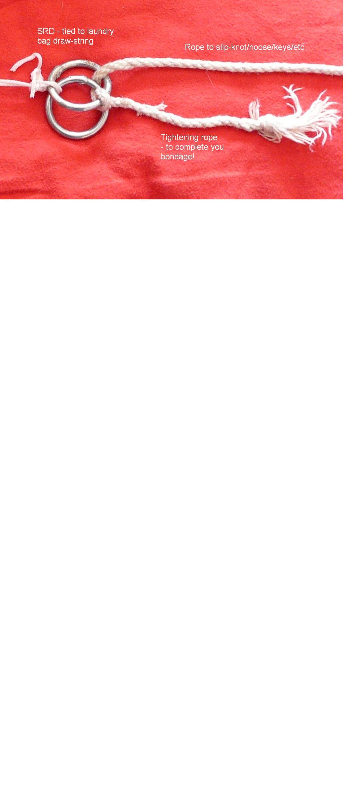 My version of the SRD and ice-release - madjack - 30 Jul 2009 Hi to all In many of my postings I've mentioned the use of an SRD and ice-release; well it's time to share my method. I'm not claiming anything radical or new, but it may help or inspire others to greater adventures. Equipment Small laundry bag (the ones provided to hold washing powder tablets are best) 3 metal rings – with approx 35mm internal diameter Rope Ice cubes How to: If you look at the photos it should be self-explanatory, but in simple terms: Assemble the SRD as you normally would (in the photo I’ve used the laundry bag draw-strings to tie the SRD rings together, but you can use rope and extend that to the draw-string as desired) Tie the 3rd ring to a secure fixing of your choice. Place your required number of ice-cubes in the laundry bag (limited only by the size of bag and your sense of adventure!) Now thread the draw-string and neck of the bag through the 3rd ring and tie to your SRD The draw-strings are very tough, as are the bags, and I’ve not had any snap or fall apart so far. Now you can use the SRD as normal, but when the ice melts in the bag, the whole SRD assembly comes free and so should you! As always, test and test again before using for real and always ensure your rings are free from snags and rough edges. Enjoy MJ RE: My version fo the SRD and ice-release - Like Ra - 30 Jul 2009 Actually, it can be anything like a sock, for example. Not necessarily a laundry bag. RE: My version fo the SRD and ice-release - madjack - 30 Jul 2009 True - the classic stocking would work just as well. I opted for the laundry bag for ease of set-up and adjustment - I can leave it tied to the whole rig and simply top up the ice cubes (which individually will pass through the ring) to quickly extend or re-start a session. MJ RE: My version fo the SRD and ice-release - Like Ra - 30 Jul 2009 Oh, yes, I mean a sock (or even a cotton bag, see here) will be much more difficult to tear. RE: My version fo the SRD and ice-release - madjack - 01 Aug 2009 Ah-ha! Another posting I'd missed - at least it means I'm on the right lines if not actually inventing anything 'new'. Question: does ice in the cotton bag take much longer to melt? I guess this is yet another factor when setting up an ice-release method. So far we know that you need to work out: 1) room temeprature (obvious - warmer = quicker melting) 2) number of ice cubes/size of ice block (another obvious one - more = longer until freedom) 3) size of metal ring/loop that release will be pulled through (smaller = slower) 4) material ice is held in (I think cotton will retain the coldness longer than something with a more open weave, such as a laundry bag) 5) tension or pressure on ice release (not always obvious, but simply put more presure = quicker release. preasure can be you pulling or the weight on the end of the stocking/sock/whatever.) All in all, a complex set of parameters to be considered... or you could just say "what the hell" and go for it! 😊 MJ RE: My version fo the SRD and ice-release - Like Ra - 02 Aug 2009 (01 Aug 2009, 21:18 )madjack Wrote: Ah-ha! Another posting I'd missed - at least it means I'm on the right lines if not actually inventing anything 'new'. We are just on the same wave and same ideas are soaring in the air 😉 (01 Aug 2009, 21:18 )madjack Wrote: Question: does ice in the cotton bag take much longer to melt?True, only experiments can show. But the general rule is half kilo of ice in a plastic bottle melts in ~4hours. So I doubt it will take more than 6 hours. (01 Aug 2009, 21:18 )madjack Wrote: or you could just say "what the hell" and go for it! 😊 Exactly what I do 😉 The rule of thumb is do not overestimate your stretching etc abilities regardless time. The position should be comfortable. If something hurts in the very beginning, it will be unbearable in an hour or so. So take time to redo/readjust when your hands are not bound yet. RE: My version fo the SRD and ice-release - madjack - 02 Aug 2009 And the key words are.... 'The position should be comfortable.' If only I listened to that advice myself and didn't get carried away! 😊 MJ |